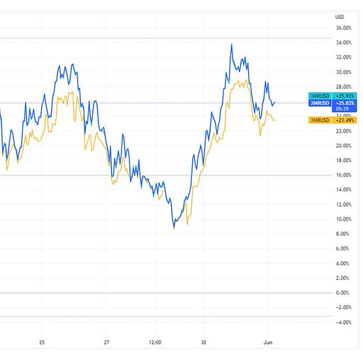 Since mid December 2021, Monero has been trending up against Ethereum, establishing higher lows for over 5 months.