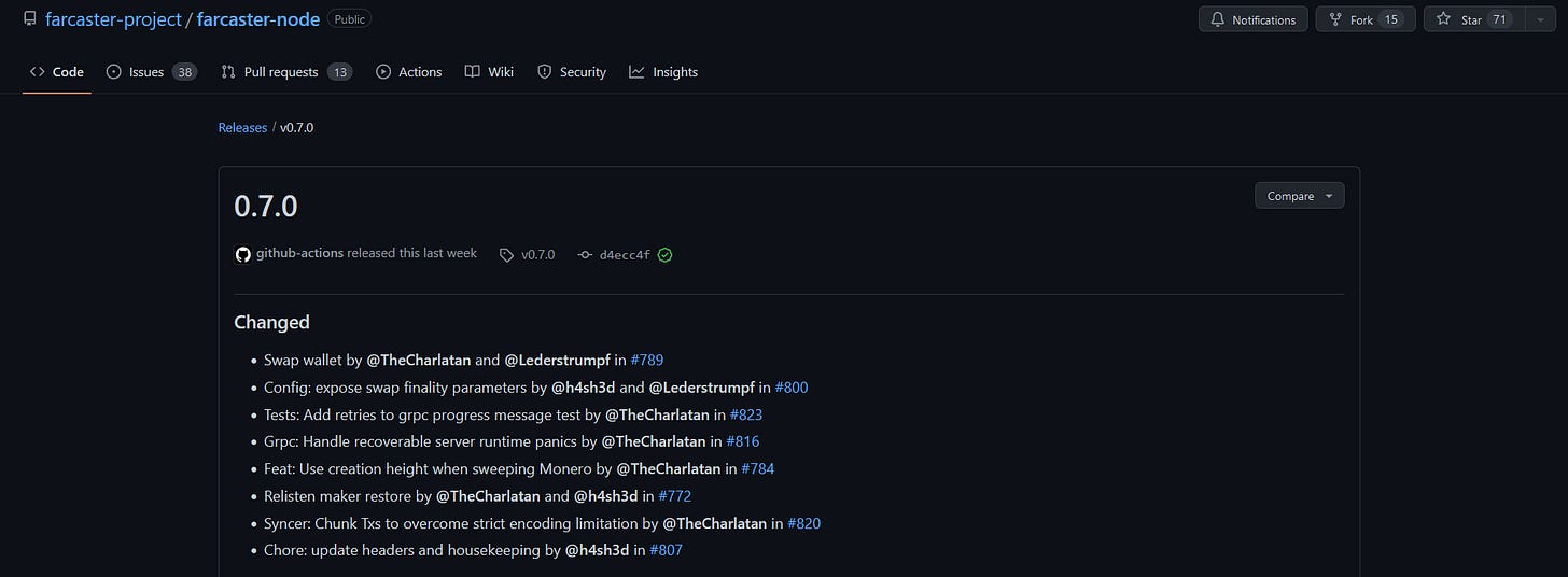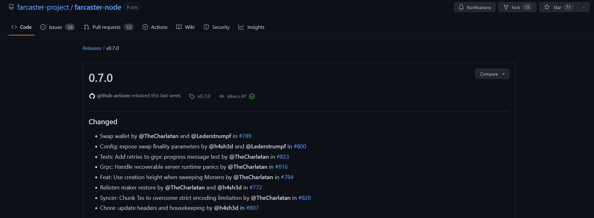 The Farcaster Project has released version 0.7.0 of the Farcaster cross-chain atomic swap node. Check out their GitHub for more information.
