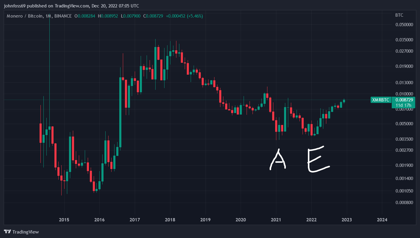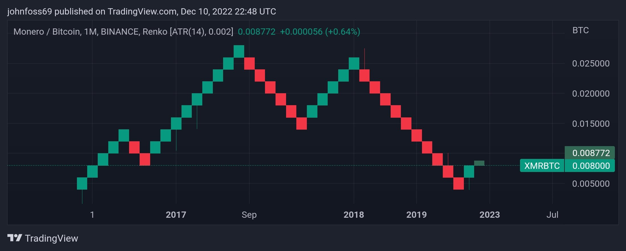 With the November monthly close above 0.008btc, XMR printed its first green candle in almost 5 years on the XMR/BTC Renko monthly chart. This may be the signal for a long-term trend change.
