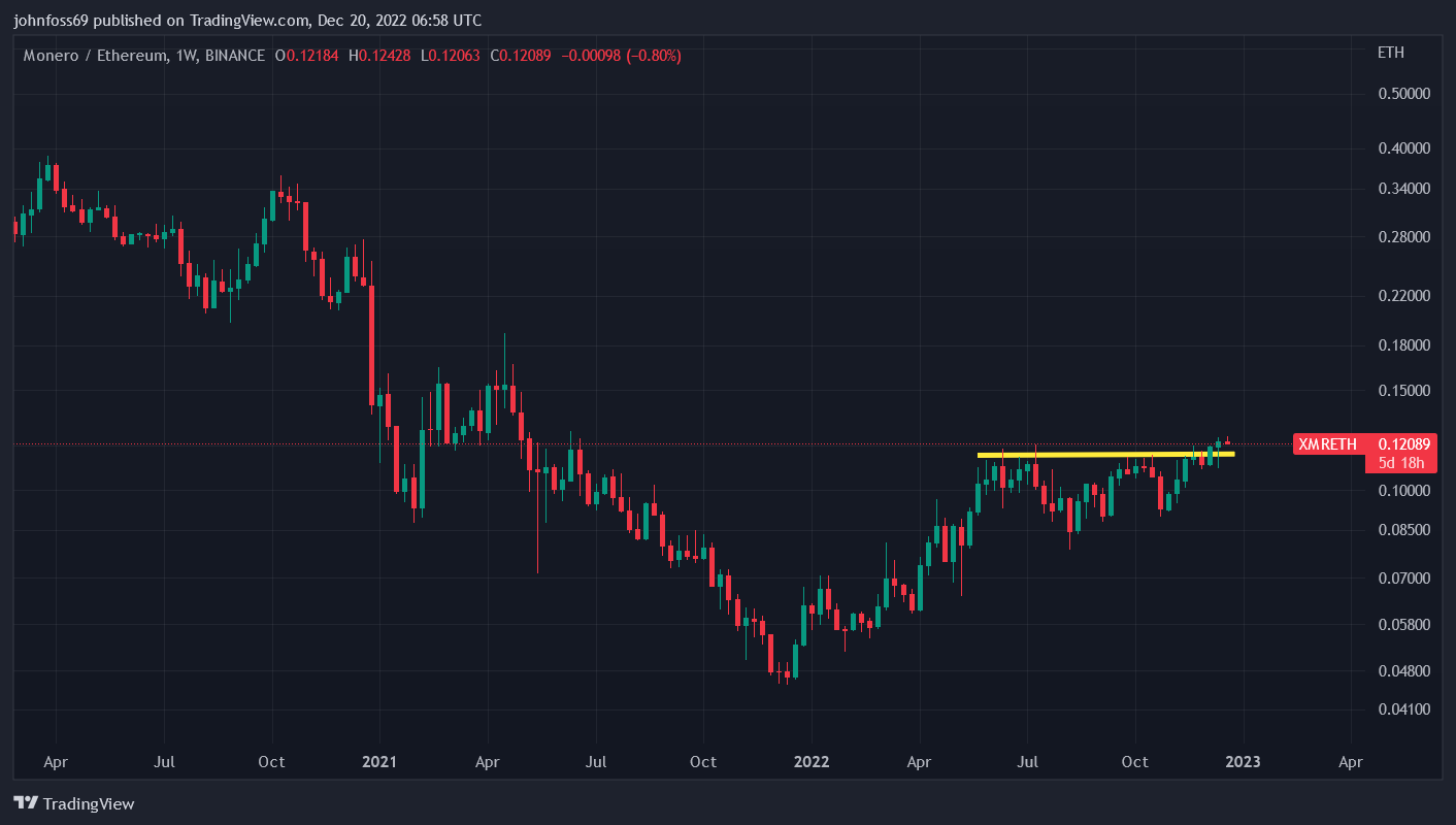 Monero is up ~120% against ETH YTD and looking like it wants to break out upwards.