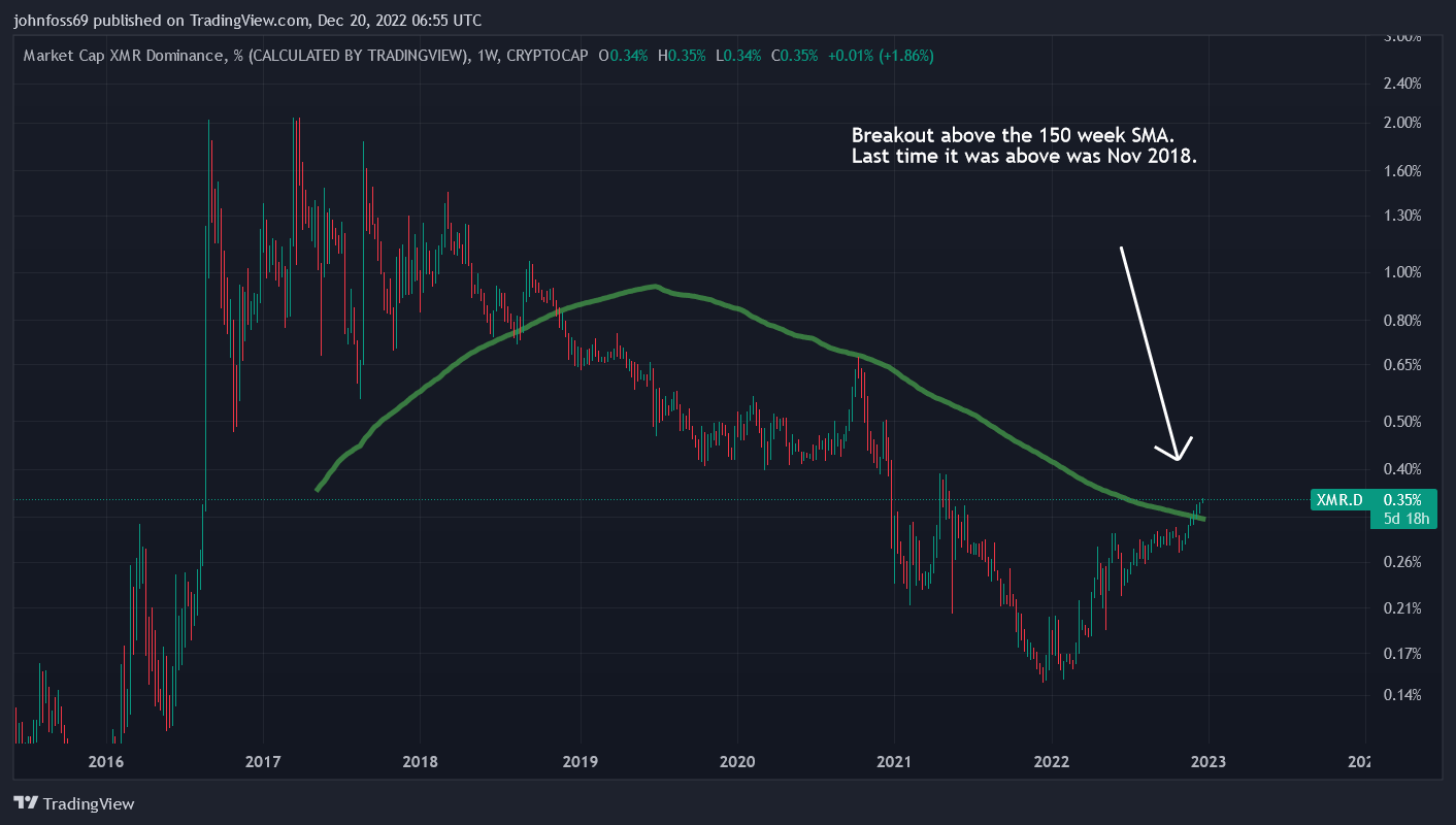 XMR dominance has broken out above the 150 week SMA. XMR hasn’t seen these levels since November 2018.