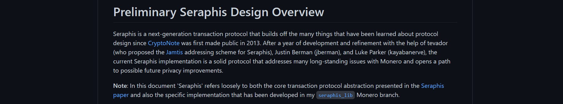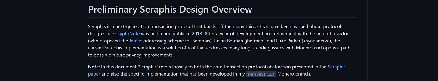 UkoeHB, the inventor of Seraphis, published a design overview with updated information about Seraphis and Jamtis. Seraphis is a next-generation transaction protocol that builds off the many things that have been learned about protocol design since CryptoNote was first made public in 2013.