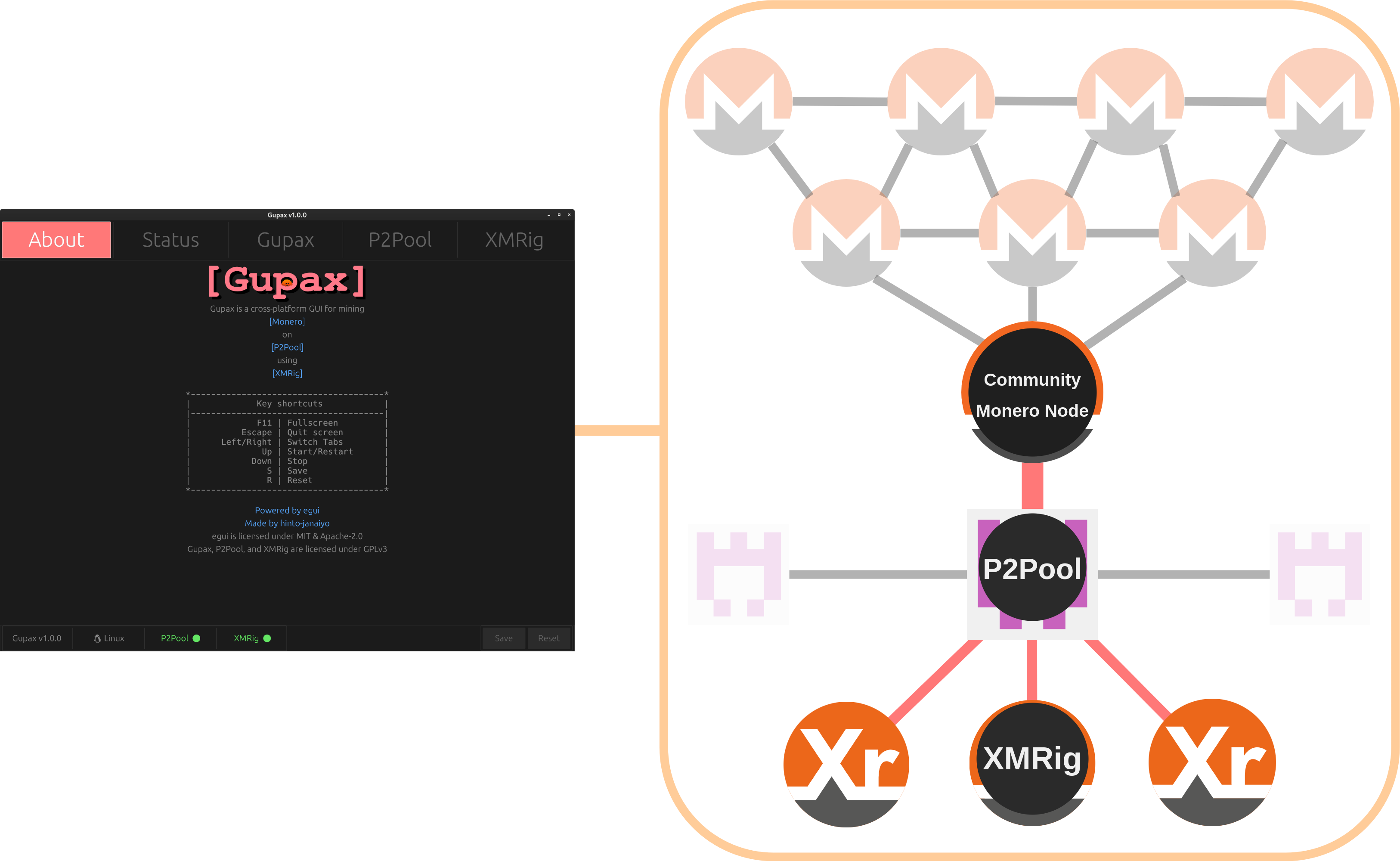 hinto-janaiyo has released beta version 0.9.0 of Gupax, a cross-platform GUI that helps with configuring, updating, and managing P2Pool and XMRig. Gupax is a completely separate GUI that can act as a companion alongside Monero GUI. One window with monerod and wallet, and another for P2Pool mining. It can act stand-alone as well, connecting to a remote node so no Monero node is needed. Check out this post along with the GitHub page here.