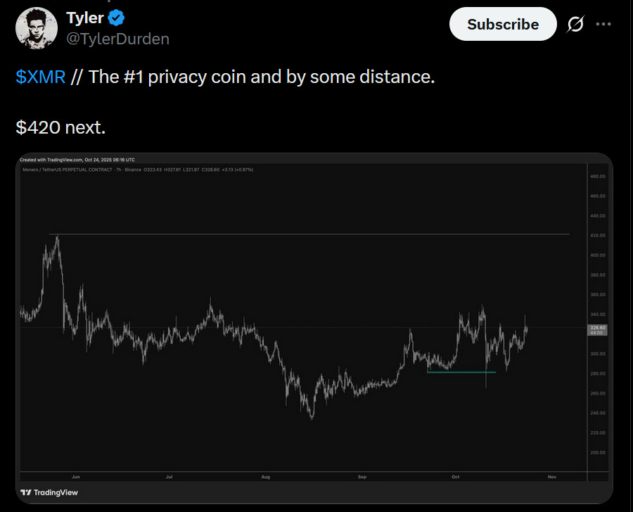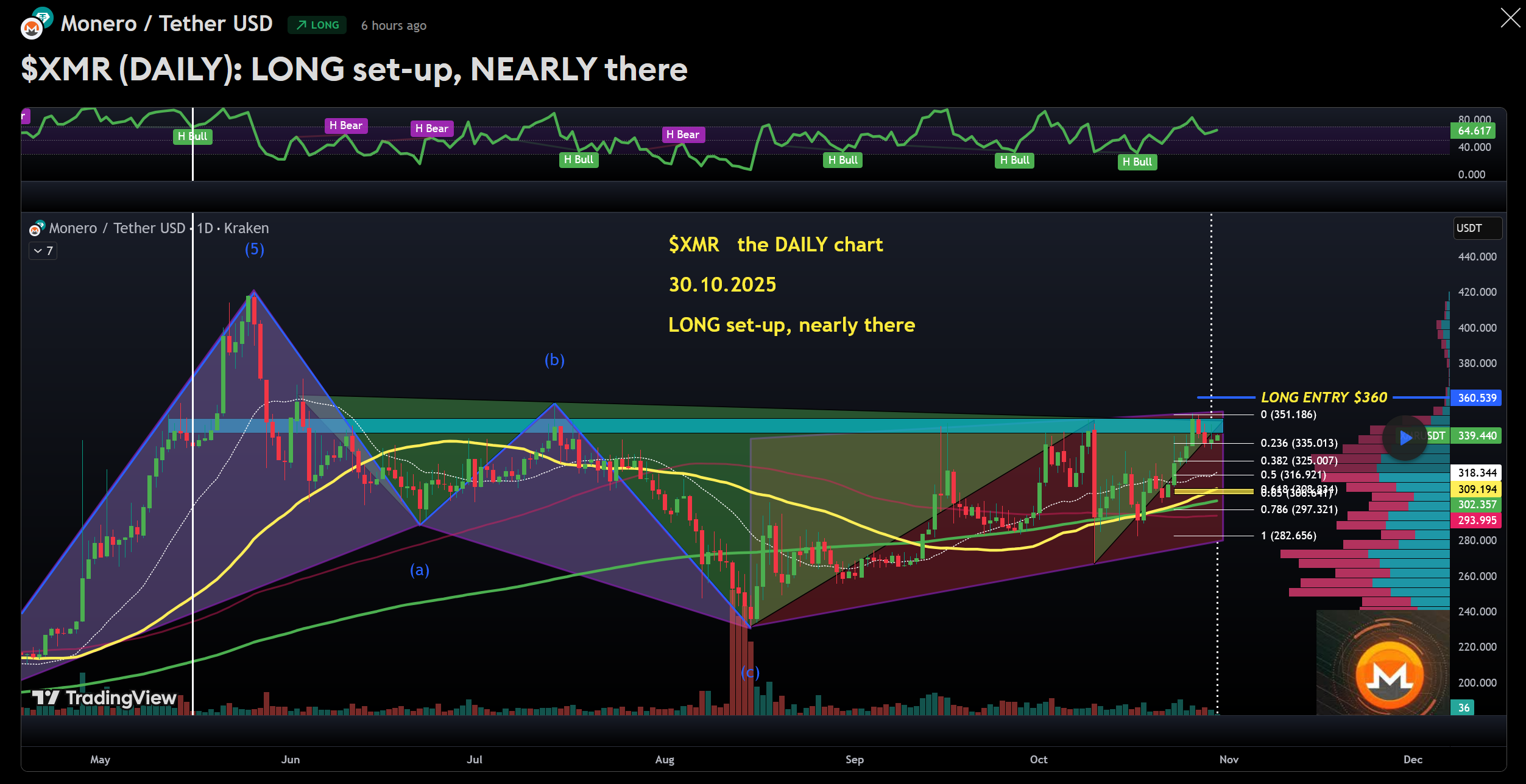 ColdBloodedCharter shared an enthusiastic post calling Monero (XMR) his “favorite chart in the game,” highlighting a strong bullish setup with multiple converging patterns. He’s watching for a breakout above $355–360, noting a bullish RSI and an emerging inverse head-and-shoulders formation, suggesting potential upside momentum for XMR compared to weaker setups like ZEC.