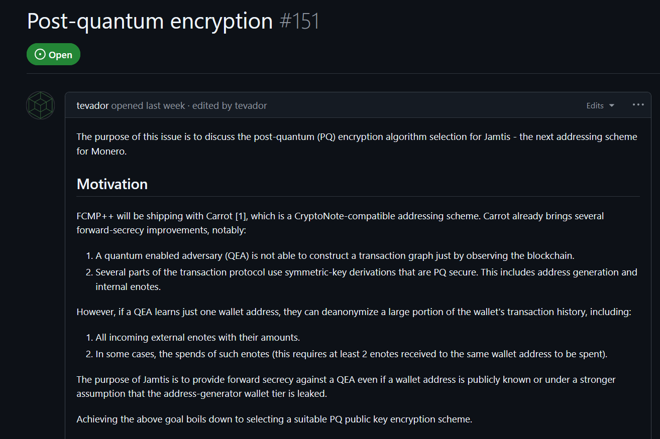 Tevador has updated the Post-Quantum Encryption issue discussing algorithm selection for Jamtis, Monero’s next-generation addressing scheme. Jamtis aims to maintain forward secrecy against quantum-enabled adversaries, even if a wallet address or generator tier is exposed. Tevador proposes using a hybrid encryption approach that combines classical Curve25519 with post-quantum CSIDH (or its faster variant CSURF), with CSIDH-1024 favored for stronger long-term security. More information can be found here.