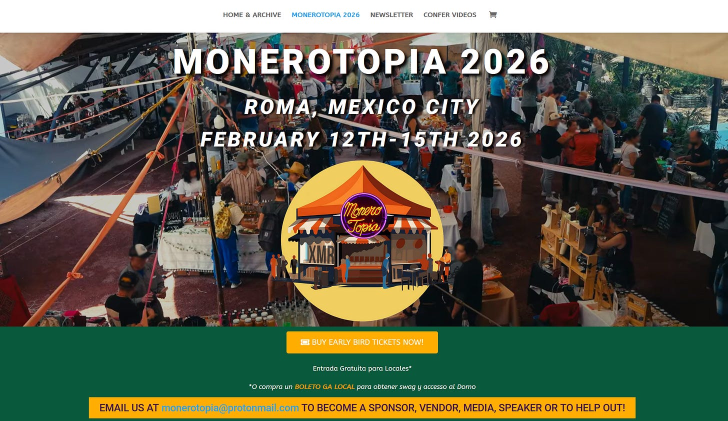 MoneroTopia 2026 will be held from February 12–15, 2026, at Huerto Roma Verde in Mexico City, promising four days of talks, workshops, and community events centered on financial privacy and Monero adoption. Hosted by Sunita and Douglas from Monero Talk, the conference features speakers such as Rucknium, Diego Salazar, Paul Puey, and Amir Taaki. Tickets are available on monerotopia.com, including discounted and free local options.
