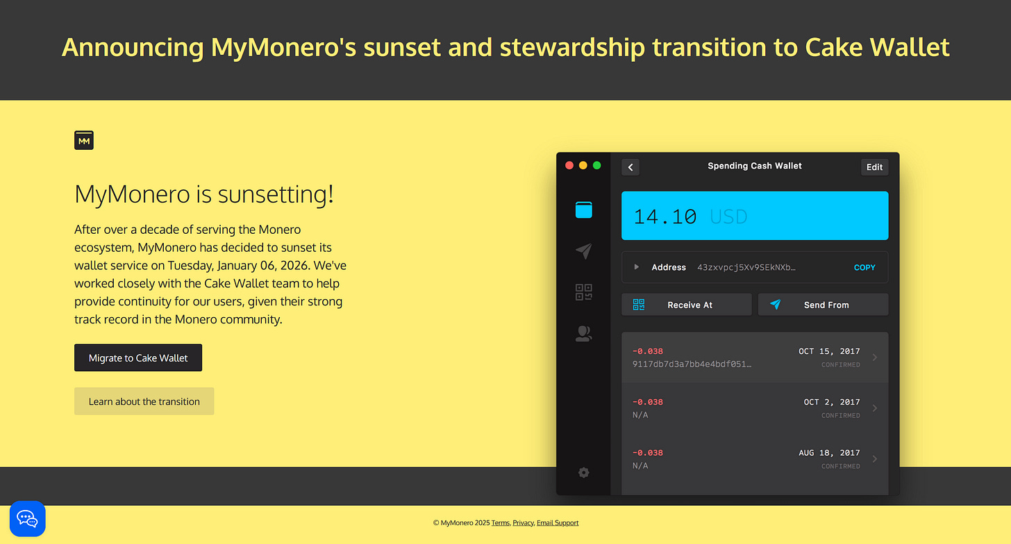 After over a decade of service, MyMonero will shut down on January 6, 2026, with stewardship of its wallet transitioning to Cake Wallet. To uphold Monero’s strict privacy standards, no view keys or wallet data will be shared between services, and all MyMonero server data, including view keys, transaction history, and logs, will be permanently destroyed within 30 days of shutdown. The transition reflects MyMonero’s aim to support more decentralized, privacy-preserving wallet solutions as the Monero ecosystem evolves. For migration support, reach out to support at Cake Wallet or MyMonero. More information can be found here.