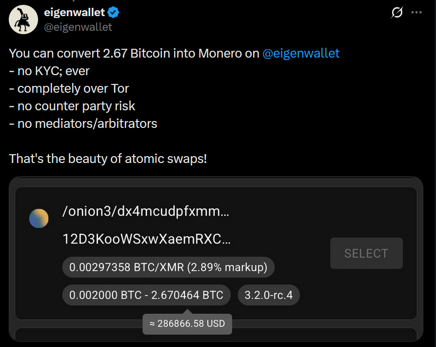 eigenwallet, formerly UnstoppableSwap, a self-custody wallet for Monero and Bitcoin that integrates atomic swaps, tweeted that liquidity is growing, and you can convert 2.67 Bitcoin into Monero using their wallet.
