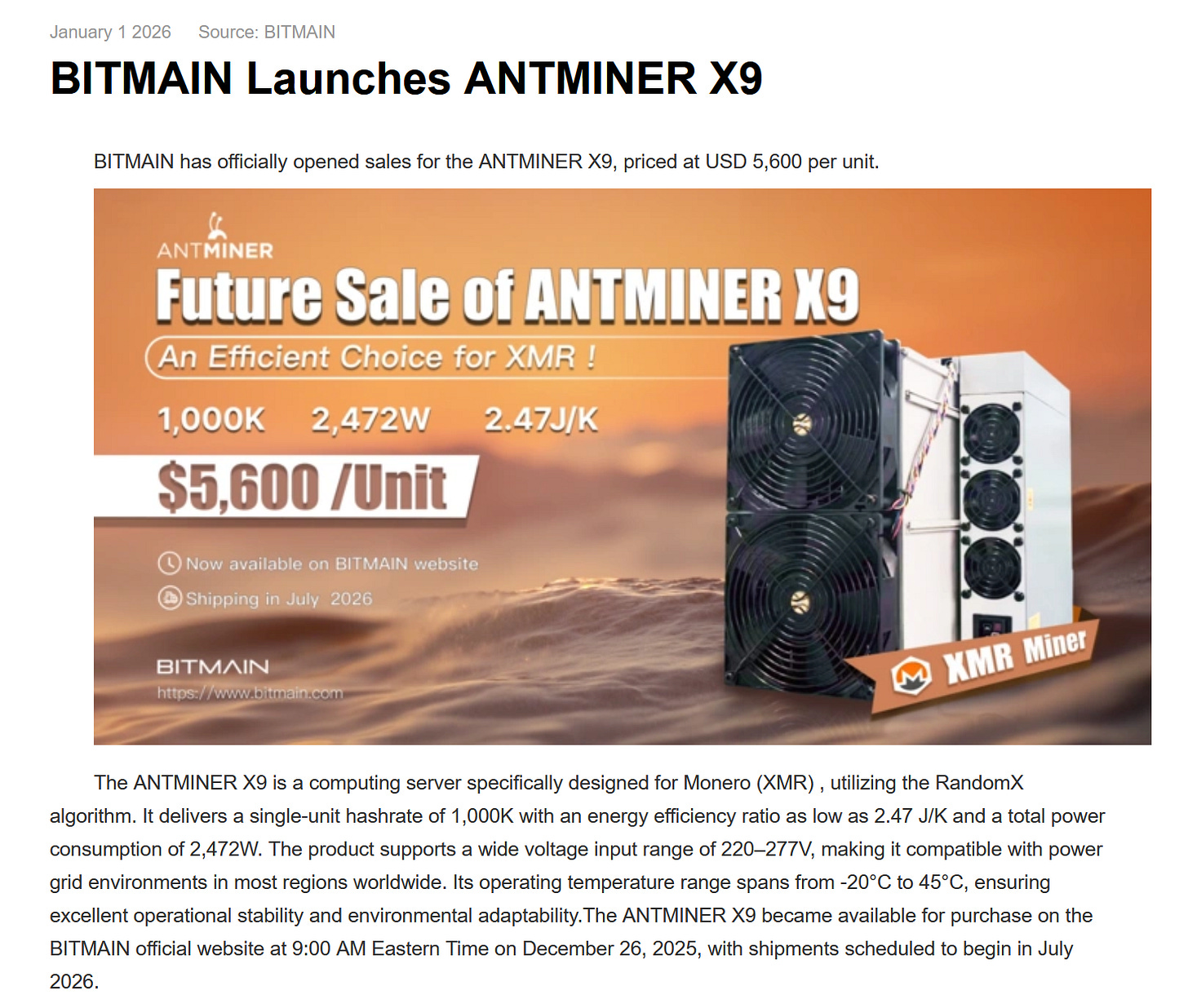 Bitmain is claiming its new Antminer X9 can mine Monero at up to 1 MH/s, but the announcement mostly reinforces why RandomX exists in the first place. Monero’s proof of work is deliberately designed to favor general purpose CPUs and make specialized mining hardware expensive, inefficient, and risky. Many in the Monero community see the X9 less as a true ASIC breakthrough and more as a costly custom CPU attempt dressed up as an ASIC. With RandomX continuing to evolve specifically to resist vendor driven centralization, Bitmain’s move looks like another reminder that Monero is built to resist the control of a single hardware manufacturer.