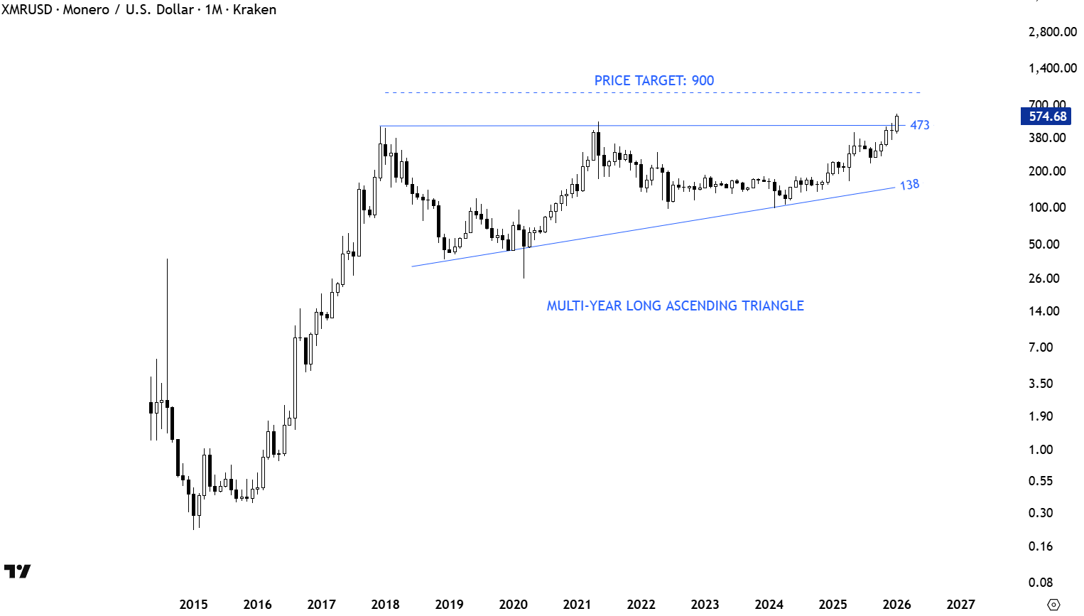 Aksel Kibar, a well respected chart technician, continues his bullish calls for XMR, targeting $900.