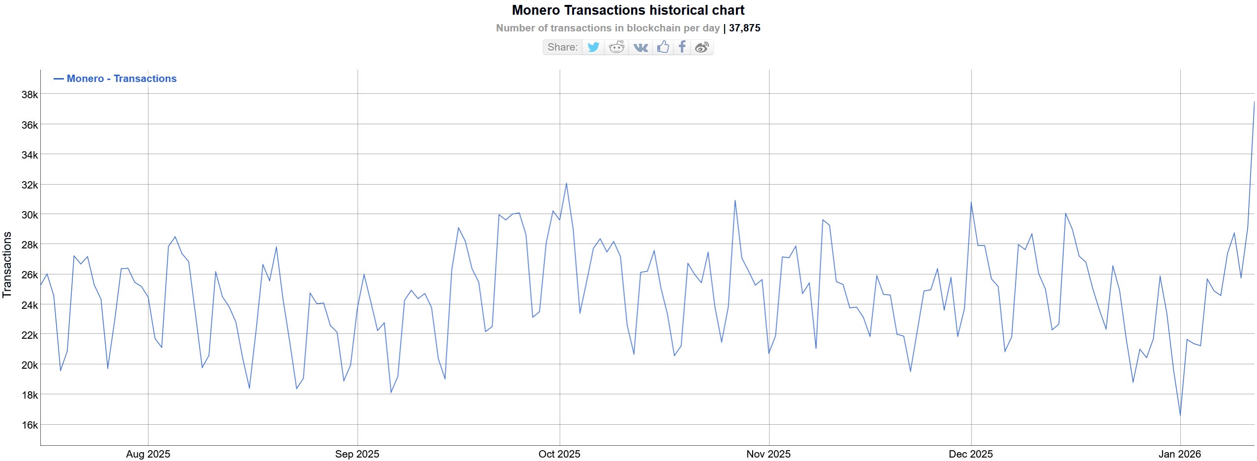 Monero transactions are spiking at the time of writing, sitting at over 37,000 transactions for the day.