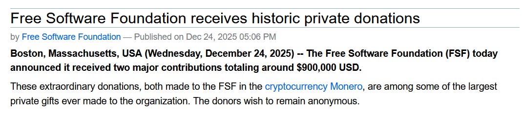 The Free Software Foundation announced it received nearly $900,000 in anonymous donations paid entirely in Monero, one of the largest private gifts in its history. The FSF says the funds will strengthen its technical infrastructure and advocacy work, highlighting how privacy-focused digital cash aligns with free software values like user control and ownership.
