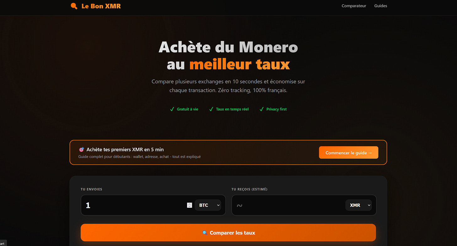 A Monero user shared a new tool called Le Bon XMR, a website that helps French speaking people compare XMR exchange rates in real time. Built to solve the common problem of hidden price differences, it checks rates from ChangeNow, StealthEX, and FixedFloat side by side so you can quickly see which one offers the best deal. The site is free to use, has no tracking or cookies, shows potential savings in euros, and is French first while still working for anyone. The creator is upfront about using affiliate links and is also publishing French language Monero guides to help grow local adoption. Check it out here.