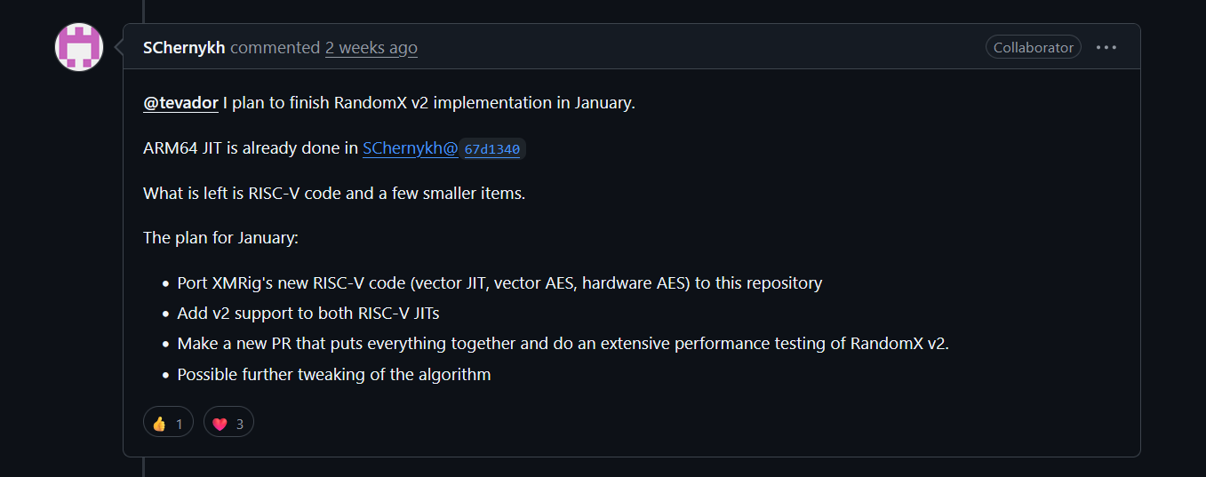sech1 provided a RandomX v2 update confirming the upgrade is not abandoned and is still planned for the next Monero network upgrade. The change focuses on making mining more efficient on modern CPUs by removing bottlenecks in the current algorithm and adding new RandomX commitments that make block verification faster. Regular computers should get more useful work done per unit of power, while specialised Bitmain X9 machines are expected to lose around 30 percent of their efficiency, with development aiming to finish in January ahead of an early 2026 release. More information can be found here and here.