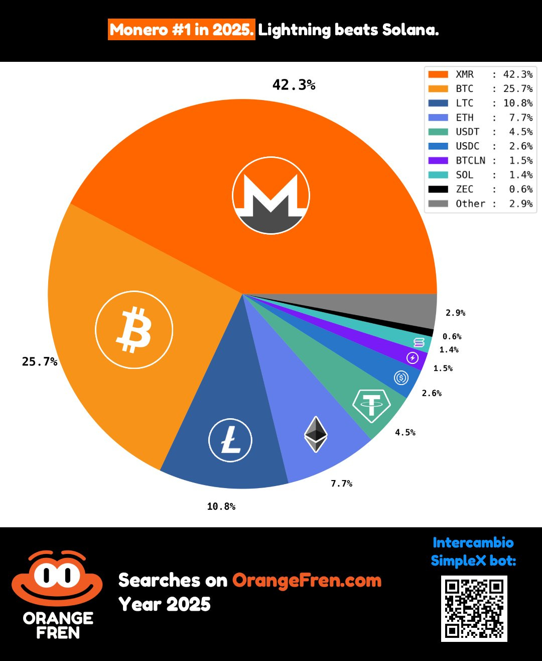 OrangeFren shared its 2025 search stats showing Monero as the clear standout across the entire year. Data from OrangeFren shows XMR accounting for 42% of all searches in 2025, well ahead of Bitcoin at 25%, with every other asset trailing far behind. The numbers highlight sustained grassroots interest in Monero relative to the broader crypto market, not just short term hype.