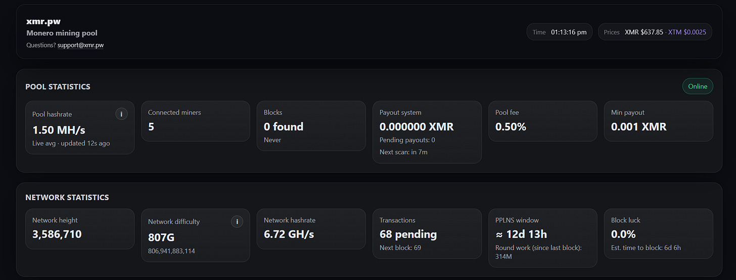 RealAleNet shared a new public mining pool called xmr.pw that focuses on a clean, modern dashboard and better visibility for miners. The pool is currently in beta, has around five miners connected at the time of writing, and not yet found a block at the time of writing. It supports Tari merge mining, allowing miners to earn XTM alongside XMR without splitting hashrate, and during testing the operator is renting hashrate and redistributing those rewards back to pool participants to help smaller miners get started.