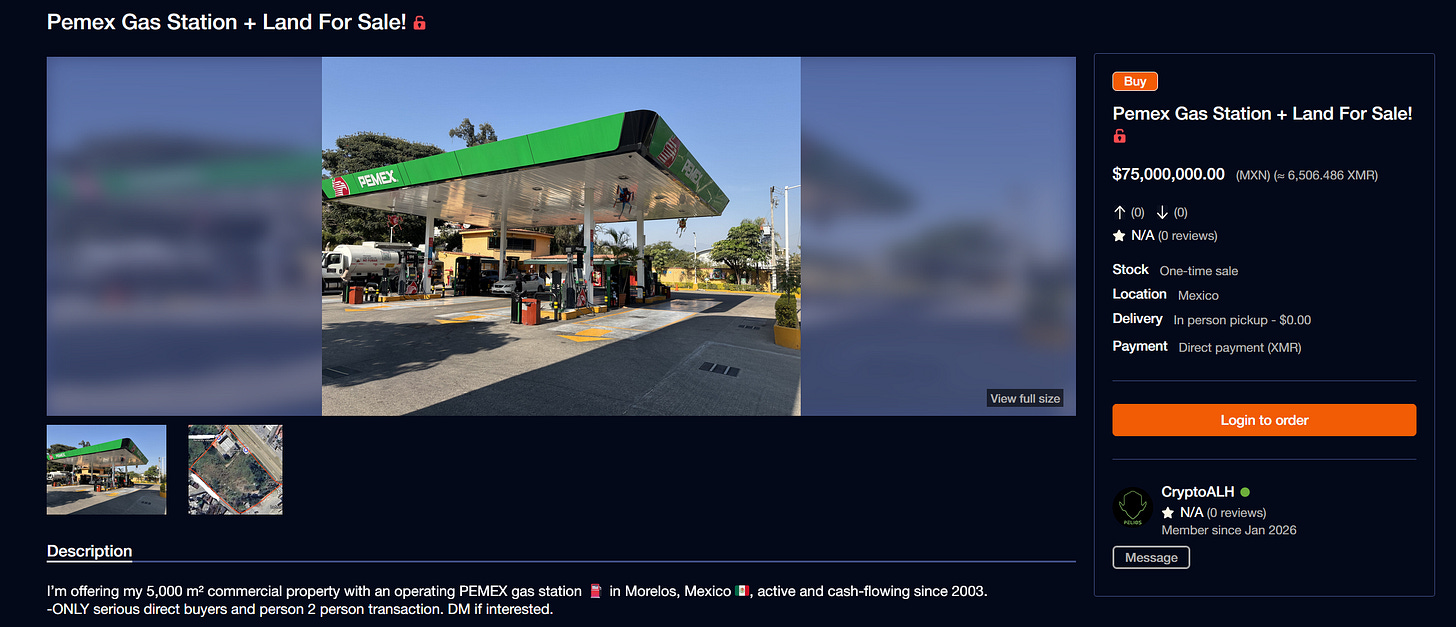 A listing on XMRbazaar has appeared offering a fully operating PEMEX gas station and attached commercial land in Mexico for direct payment in Monero. The seller is advertising a 5,000 square metre property in Morelos that has been active since 2003, priced at roughly 6,500 XMR with the transaction handled in person and paid entirely in XMR. While it is a striking example of Monero being proposed for large real world asset purchases, caution is warranted. There is always a risk the listing is illegitimate, and any in person crypto transaction carries serious personal safety risks including the possibility of a wrench attack.
