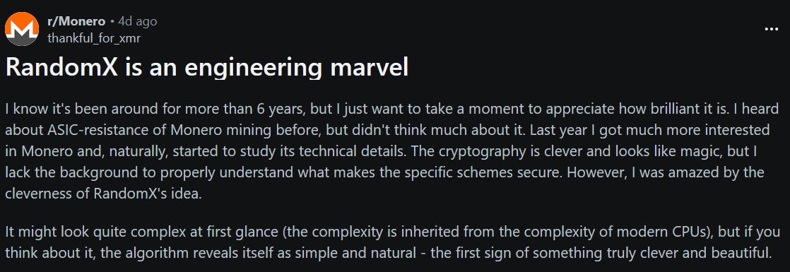 thankful_for_xmr wrote a post praising RandomX on the Monero subreddit, calling it one of the smartest mining designs in crypto. They explained how RandomX is built to run best on everyday CPUs, making it hard and expensive for specialized mining hardware (ASICs) to gain an advantage, while also refreshing parts of the system regularly to keep things fair. The post credits Monero devs for turning deep technical ideas into a practical way to keep mining open, decentralized, and resistant to control. Check it out if you want to learn more about RandomX.