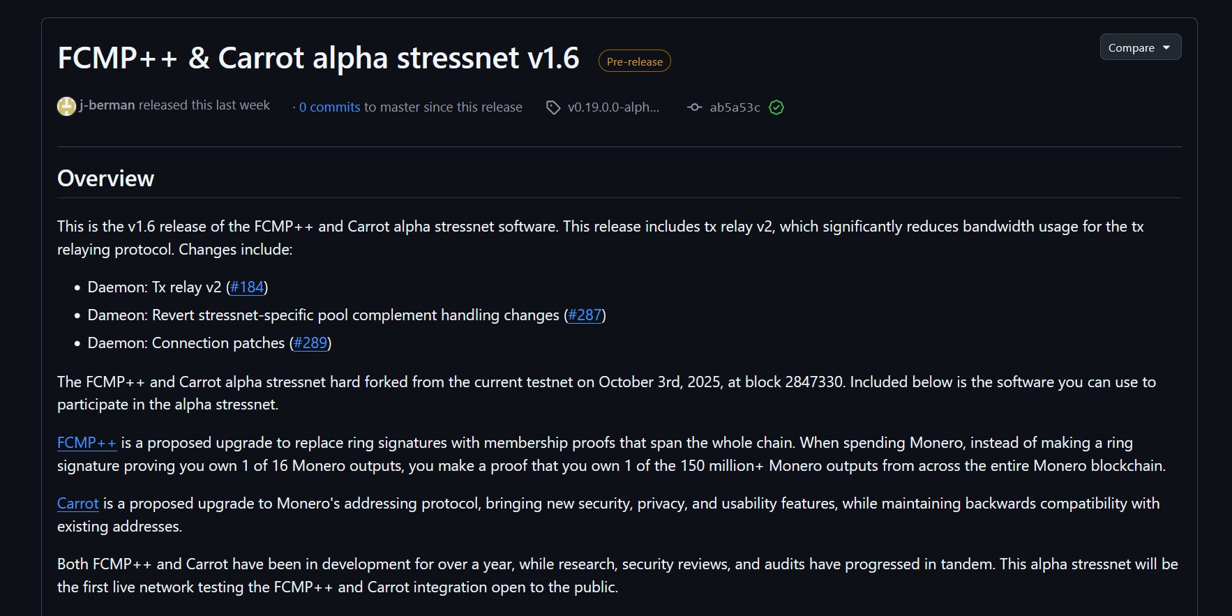 A new alpha stressnet update for Monero has been released, rolling out v1.6 of the FCMP++ and Carrot stressnet software. This lets the community try out two major proposed upgrades before they ever reach mainnet: FCMP++, which replaces ring signatures with full-chain membership proofs, and Carrot, a new address format aimed at improving privacy and usability without breaking existing addresses. The release also introduces tx relay v2, significantly reducing bandwidth usage, along with several daemon fixes. This is early, experimental software and not meant for real funds, and developers are encouraging the community to test it thoroughly and report issues to help ensure a smooth eventual upgrade. More information here.