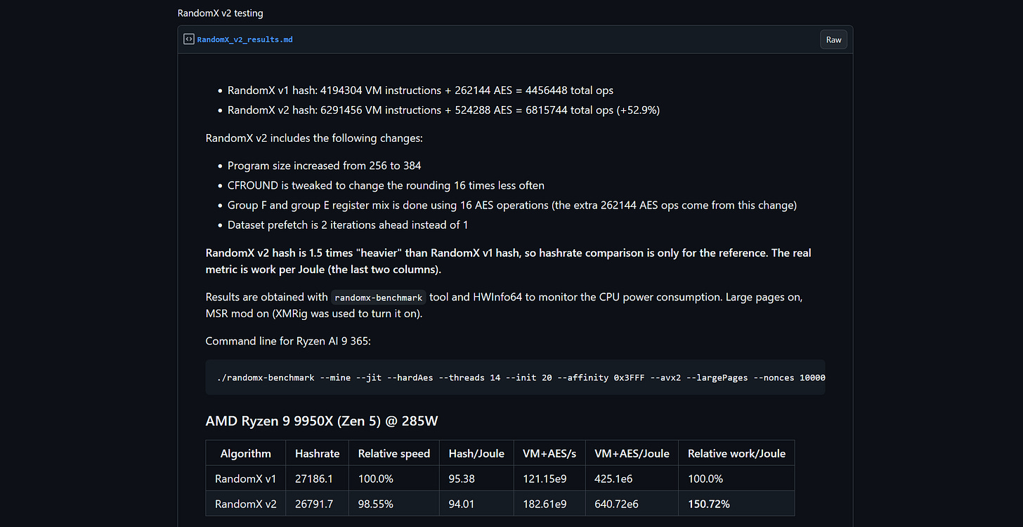 Monero developers are gathering real-world benchmarks for the upcoming RandomX v2 update, with a call for users running newer Intel CPUs to test and share results. A simple Linux script has been posted to standardize testing, with results being collected publicly to help understand performance changes and how newer and older hardware may be affected. More information and a link to the script here.