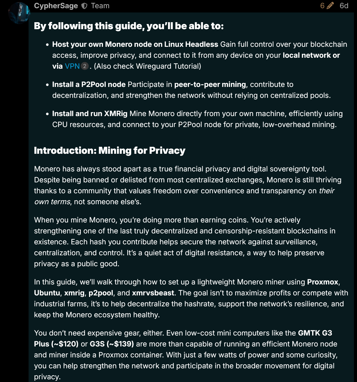 CypherSage posted a step-by-step guide on DeusOp showing how to run your own Monero node, mine on P2Pool, and use XMRig on a headless Linux setup. It walks through everything from installing Monero and enabling Huge Pages to running P2Pool Mini on low-power hardware.