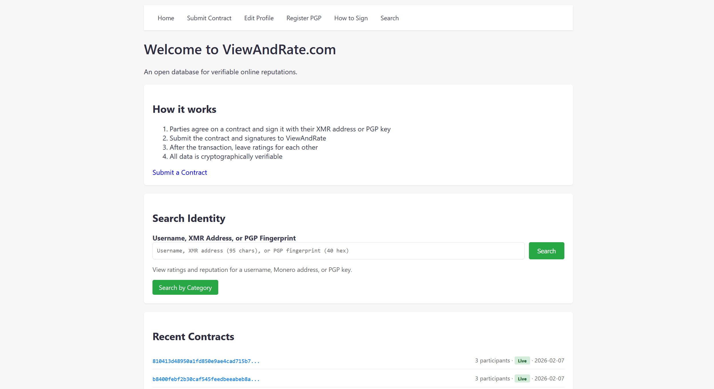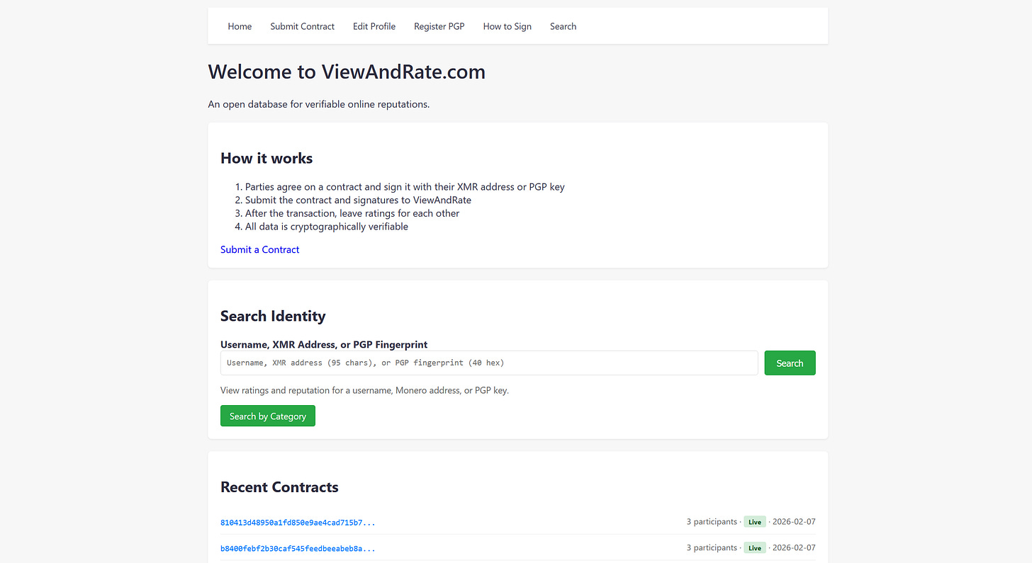 A new site called ViewAndRate.com is being tested as a way to build portable, verifiable reputations for Monero users by signing contracts and reviews with XMR addresses or PGP keys. The idea is that even if marketplaces go offline, reputations can be verified and reused elsewhere. More information here.