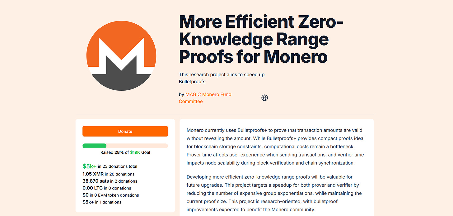 A MAGIC Monero Fund research project is raising $19,000 to speed up Bulletproofs+, the cryptography Monero uses to hide transaction amounts, making transactions faster to create and easier for the network to verify without increasing data size. The 13-week project is being led by CSIRO researchers Dr Nan Wang and Dr Dongxi Liu and is designed to support future upgrades such as FCMP++, with all code released open-source. The fundraiser is currently 28% funded after a $5,000 seed donation, with full details and donations available here, and the technical proposal here.