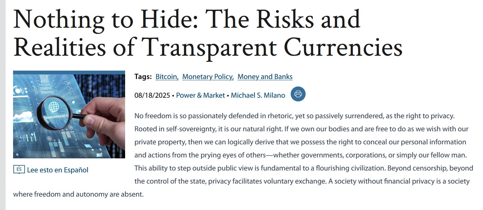 An article from the Mises Institute breaks down why transparent digital currencies come with real risks for freedom, safety, and everyday commerce. It explains how fully visible blockchains enable surveillance, price discrimination, and even physical targeting of holders, while arguing that privacy-by-default money like Monero preserves fungibility and personal autonomy. The piece makes the case that financial privacy isn’t about hiding wrongdoing, but about protecting people, markets, and voluntary exchange in an increasingly cashless world.