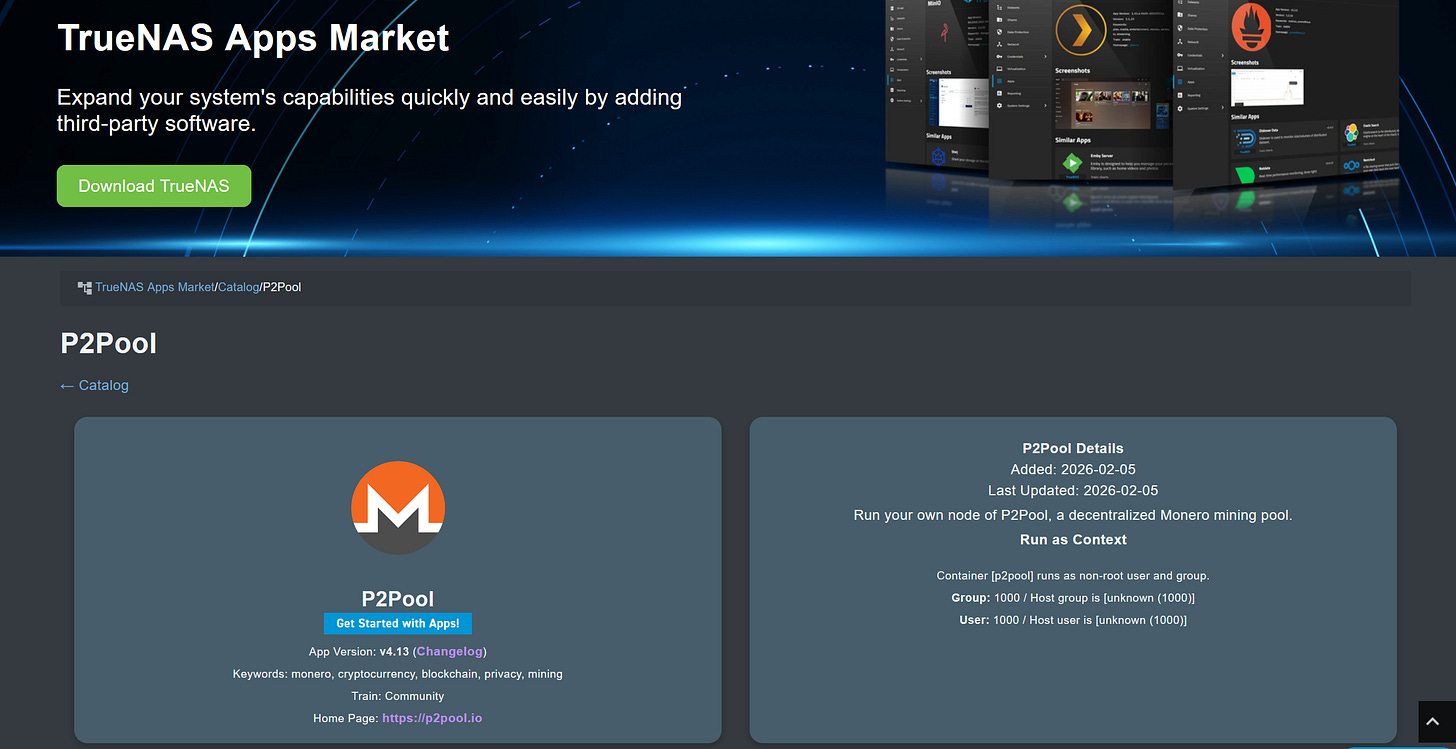 P2Pool is now available in the TrueNAS app store, making it easier to run a Monero mining node on TrueNAS. XMRig support is expected to follow, which would round out a simple self-hosted mining setup.