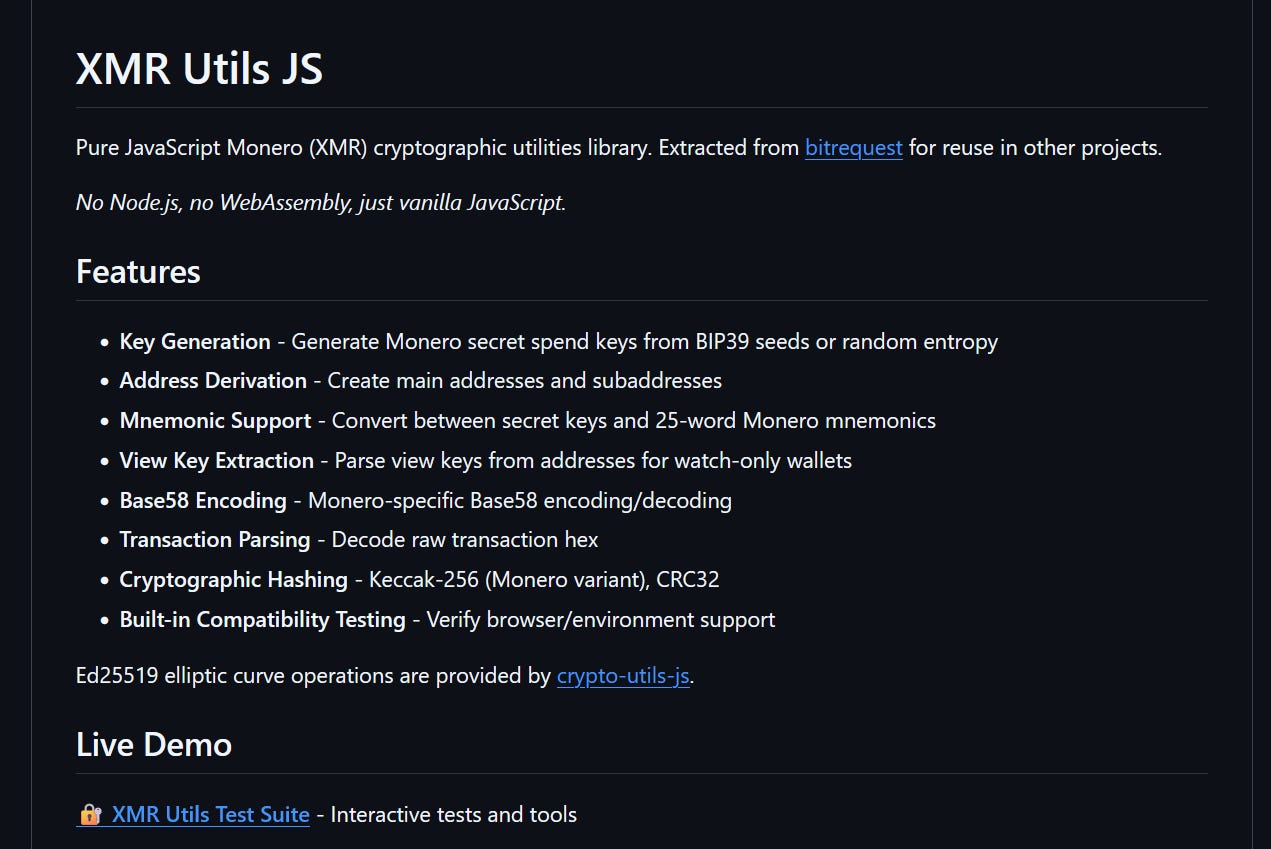 Bitrequest released a small JavaScript library that makes it easier for apps and websites to work with Monero. It handles things like generating Monero addresses, creating subaddresses, reading mnemonics, and checking transactions, all directly in the browser without extra software. It’s open-source and already used in Bitrequest’s point-of-sale app for accepting Monero payments, but since it’s new, it’s something users should review carefully before using with real funds.